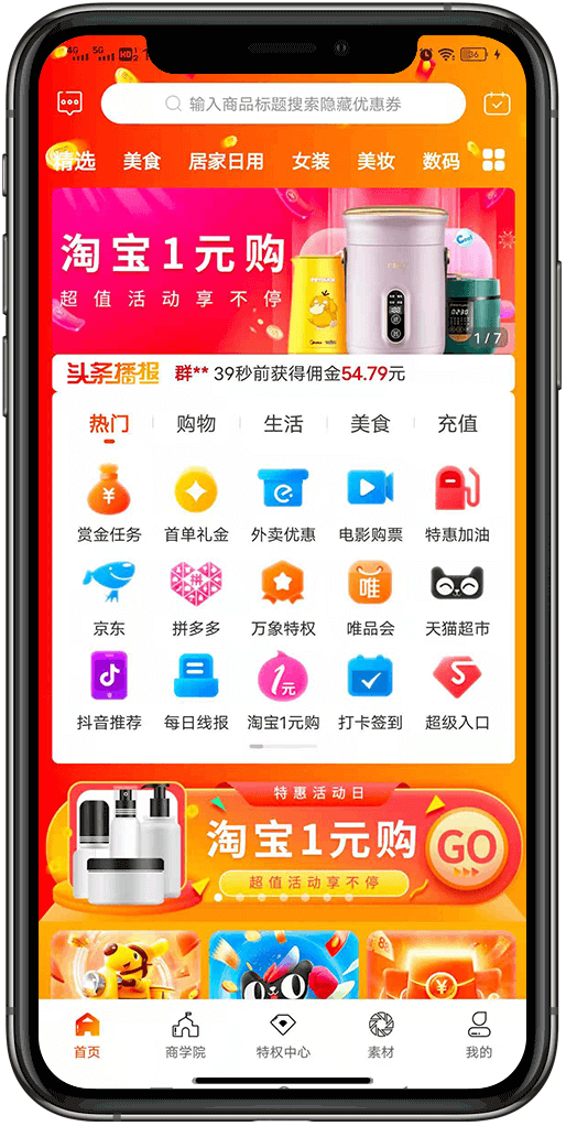 是一款手机购物APP,用户通过APP搜索电商平台的优惠券,达到购物省钱的目的,同时用户可以将商品的优惠信息链接分享给朋友、家人等,通过促成销售获益。